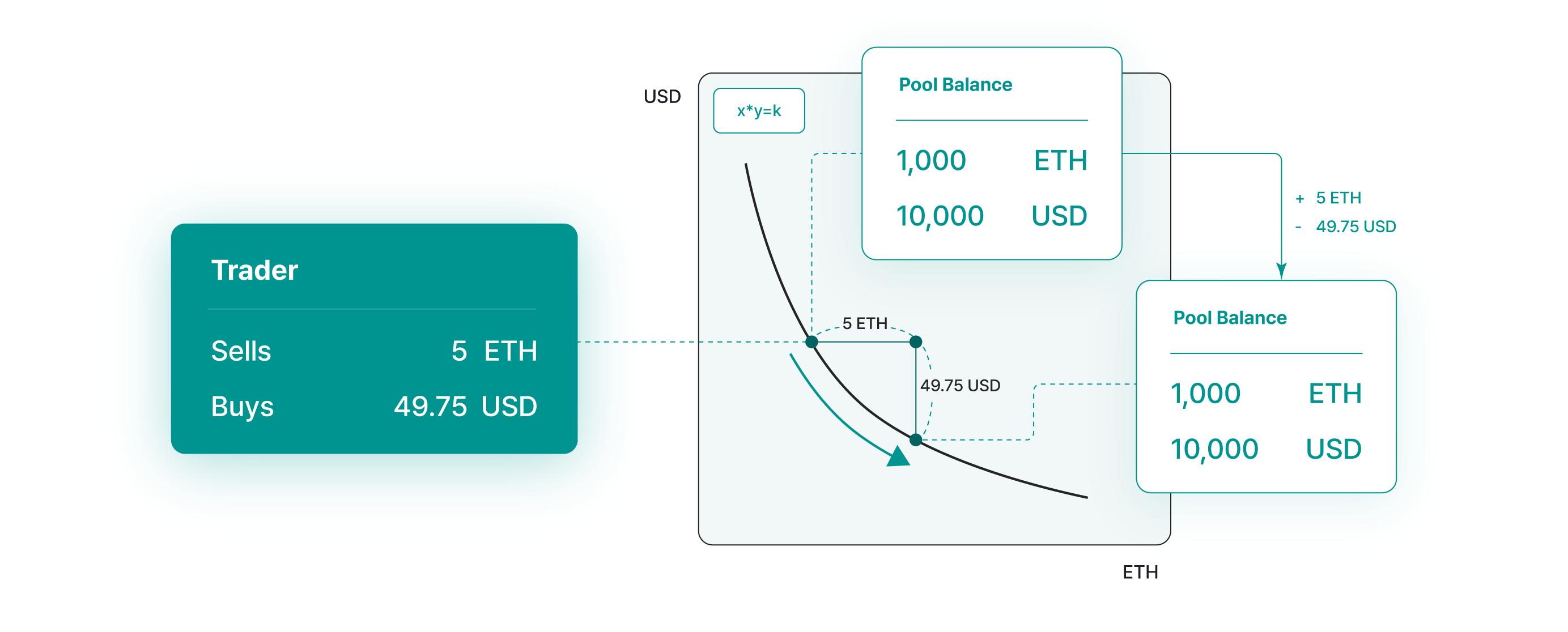 For example, let’s take a look again at a case of ETH to USD swap. Now there are 100,000 ETH and accordingly 1,000,000 USD token in liquidity pool. Selling 5 ETH, to satisfy the constant product formula $$(1,000,000-\delta\_x)*(100,000+5)=1,000,000*100,000$$, the reserve outputs $$\delta\_x\approx49.997$$of USD token. This time, expected price of ETH to USD is 9.999 USD.
